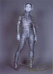 In Keitai Girl (2003), Yamaguchi Noriko wears a body suit crafted from cell phone keypads, large headphones and is draped from head to toe with wires.