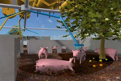 Pig City‘s proposal is to concentrate the meat production in one area. Pigs would be kept in stacked comfortable ‘apartments’ which would make them happy (and thus would mean a better taste for the meat) and save space.