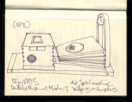Wofgang von Kempelen, better known for the Mechanical Turk, built the first speech synthesiser in 1791 (here’s a sketch I made of it in the Deutsche Museum in München). Obviously, in those days, his Sprachmaschine was a mechanical analogue of the vocal organs and so speech sounds were derived from actions, not written language. But the design is also rather theatrical: the operator placed their hands through holes in a wooden box, so that no-one could see what they were doing, heightening the magic.