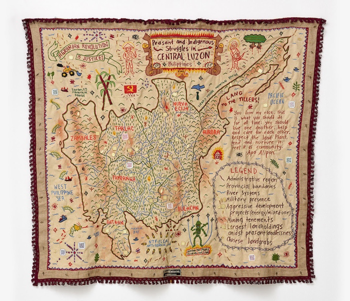 In Valley of Dispossession, for example, the artist ties together the histories of land grabs and workers’ struggles for agricultural revolution, revealing how imperial practices of extraction are destroying the land. The textile is a map of the Philippines region of Central Luzon, where people have faced centuries of oppression that started with Spanish colonialism in the 16th century.