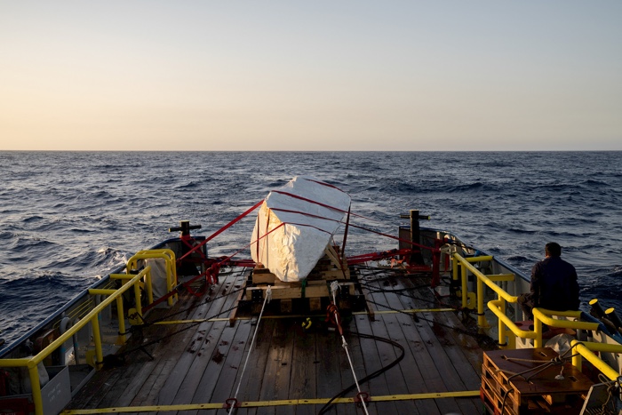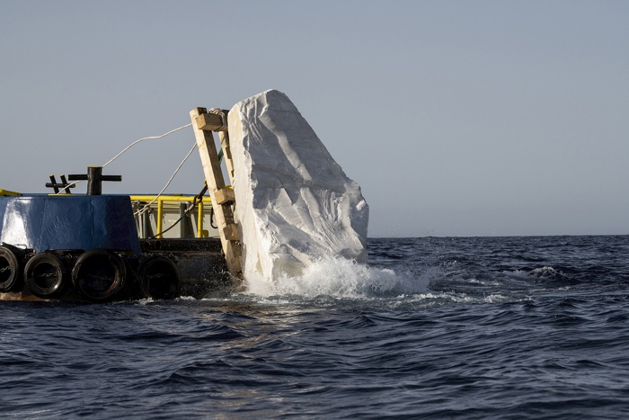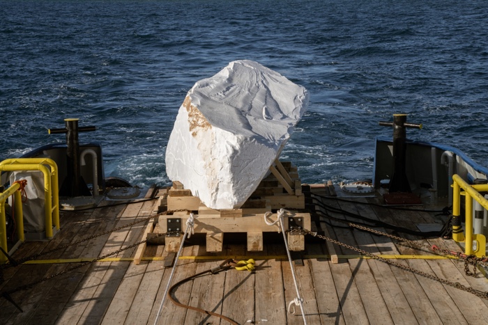 In 2010, Rosella Biscotti was awarded a 20-tonne block of marble from the Michelangelo Quarry (in Carrara, Italy), the historic quarry of Renaissance sculptors. Eleven years later, the artist loaded the block onto a boat and sailed on a journey between Italy, Malta, Tunisia and Libya. The route was designed to highlight a series of maritime issues that are more or less visible in public discourses: migrant itineraries, nautical borders demarcating oil and gas concessions, areas of military operations, historical commercial routes, or the migration of a sea turtle crossing the patrolling lines of the European Border Agency FRONTEX. She finally dropped the marble block overboard into the Mediterranean sea where it disappeared into the waters.