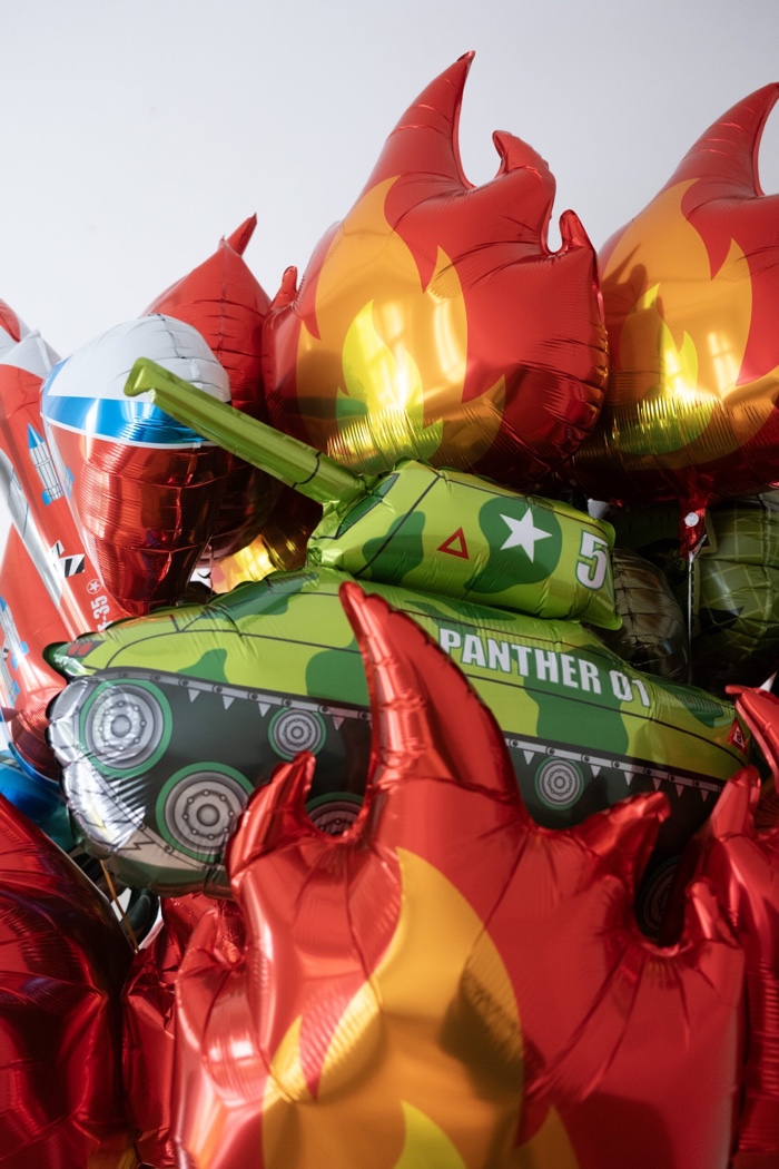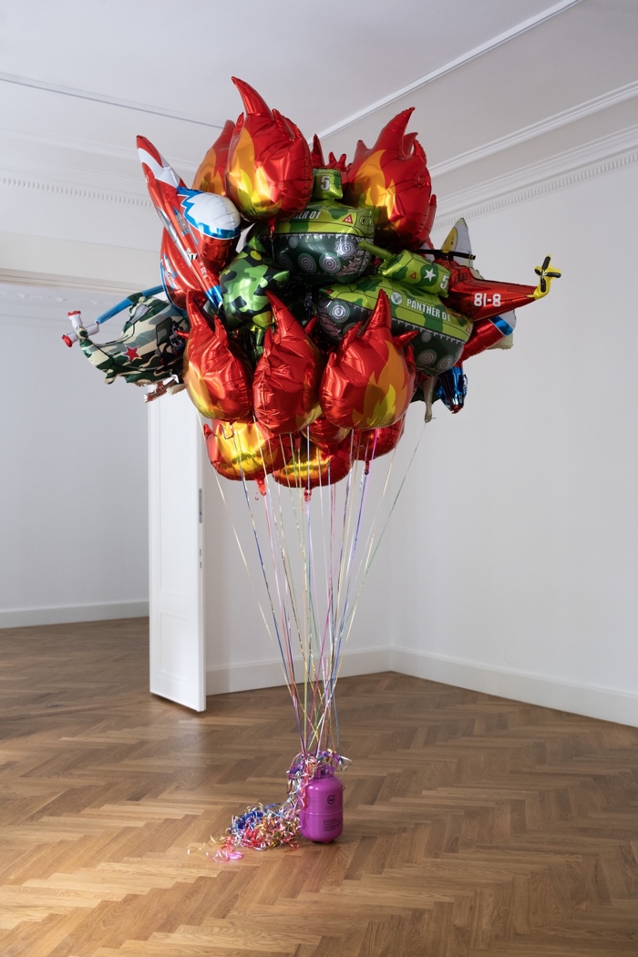 Itamar Gov’s balloon sculpture was like a magnet for children at the art fair. The artist attached a cluster of foil balloons to a pink helium container. Sourced from different children’s birthday shops, the balloons look cheerful and innocent from afar but as you approach, you realise that they are shaped like explosions, tanks and jet fighters.