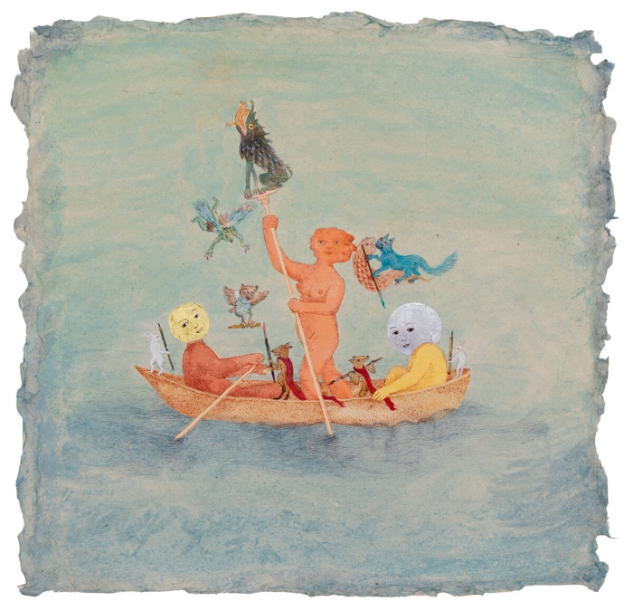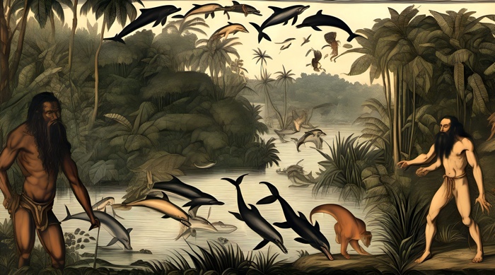 A prehistoric-like bird looks on, tigers walk on water, a pod of dolphins is flying, locals have three arms and random numbers of fingers. The bizare subjects in Carlos Motta‘s Descubriendo el Nuevo Mundo (Discovering the New World) inhabit scenes that look familiar to our Western eyes. Motta’s inkjets are an AI-enhanced take on Theodore de Bry’s visual depictions of the Americas in the 16th century. De Bry’s representations of early European expeditions to the Americas have greatly influenced the European view of the new continent. Yet, the Walloon engraver and publisher never set foot on the “New World”. His imagery of landscapes, people and events was based on second-hand information. As a result, his work is packed with errors and whitewashing of colonial violence.