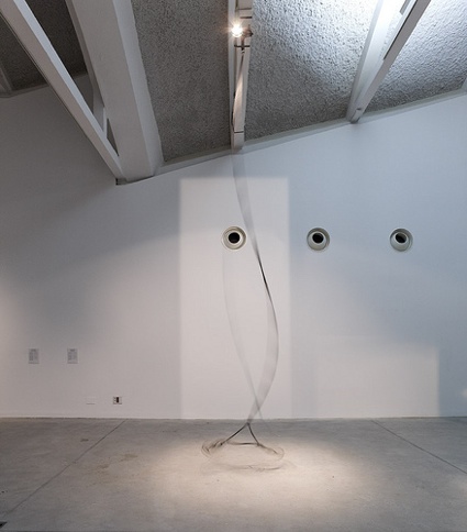 A wire brush spins around randomly, threatening your open-toe sandals. A motion-activated vacuum pump sucks out the air from a gallery space: the longer viewers remain inside, the less air for them to breathe. A cobble stone is rotating on a rope. The sole purpose of that kettle is to spread red acrylic paint on your shoes. An electric fence criss-crosses the path that leads to an art gallery or the bar. Elsewhere a randomly activated tripwire awaits visitors…