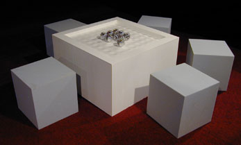 HMV is a board game, created in 2001 by ///fur/////, with which players move semi-autonomous ball robots by making sounds. Form and gravity collude with voice, board and chance. The spheres are autonomous robots that have been created to listen to a certain pitch and starts to move if the right frequency is hummed or sung.
