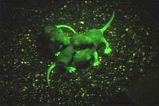In 1997, he gets the idea of creating a fluorescent mammal, a chimerical animal that does not exist in nature. He is allergic to cats so he decides to use a rabbit. The rabbit looks like an albinos in day time but in the dark and using a blue light, the animal becomes green fluorescent.