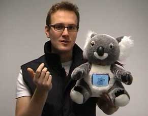 Take the toy koala and rub its belly, and it will send out a hug signal, visualized by a little animation. Your partner is wearing a normal-looking vest containing a wireless receiver, which receives the hug signal.