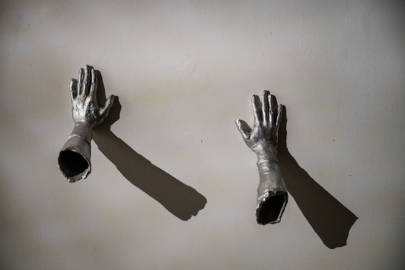 The film is accompanied by a series of sculptures. Made of cast aluminium, they make more tangible the intrusive nature of the police procedure. These sculptures also reveal a point of contact between social bodies and a state body as well as the domination by one body over another.