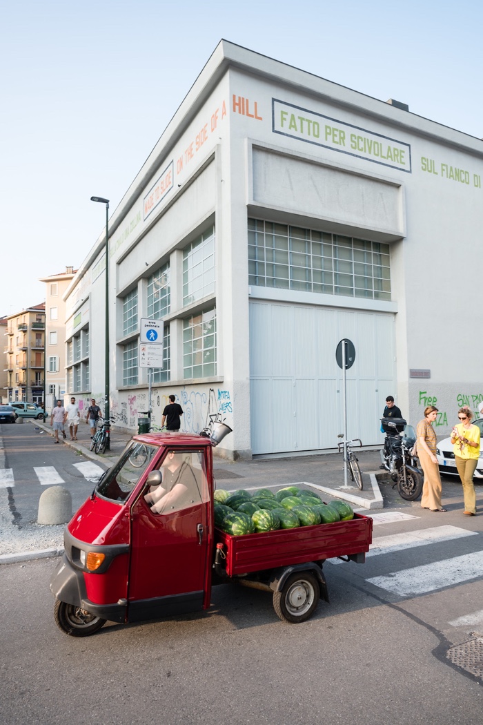 Domenico Antonio Mancini travels across the city on a Piaggio Ape, a three-wheeler associated with fruit and vegetable vendors in southern Italy. Instead of sales messages, the megaphone mounted on the utilitarian vehicle broadcasts texts by Palestinian poet Mahmoud Darwish.
