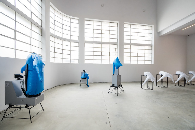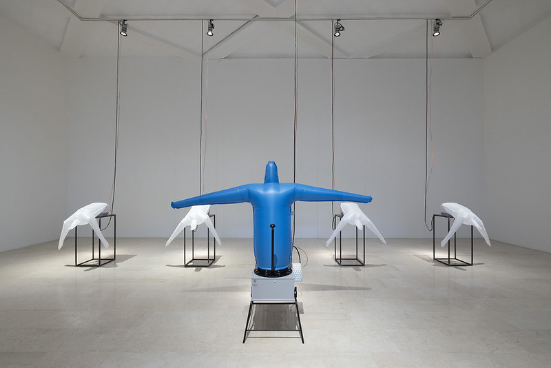There’s even more irony in All Those Stuffed Shirts, an installation consisting of seven automatic ironing machines, called dressmen, which have been algorithmically “re-educated”. Using their only means of expression, the air, the dressmen quietly inflate and then dramatically collapse following a mechanical ballet devised by the artist. The movements of the technical objects are a bit cartoonish, halfway between a ballet and a GIF animation.
