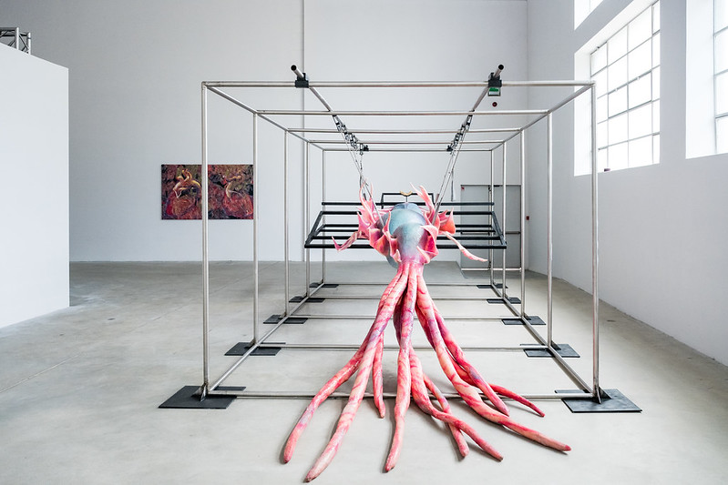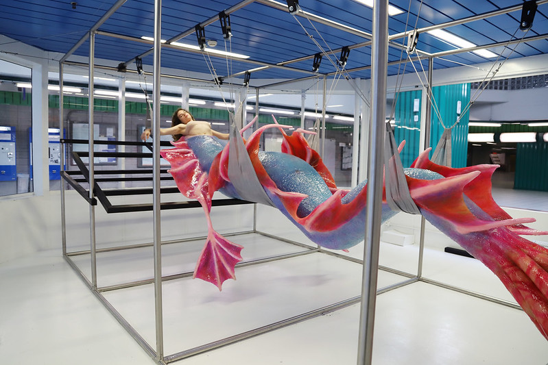 Agnes Questionmark’s delicate marine creature floats among cables and medical straps. She looks like she is trapped inside the metal structures. She is what the artist calls “a transpatient”, someone who is transgender or transhuman. But probably both at the same time. With her human upper body and her tentacles, scales and fins, she can’t exist outside of the medical and scientific machine. For now. CHM13HTERT was first shown as a performance. In 2023, the artist spent 12 hours per day suspended inside the structure. Travellers going through the Lancetti railway junction in Milan would then stop to watch her and take photos.