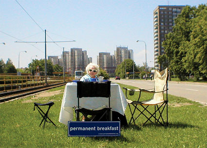 Conceived in 1996 by Austrian artist Friedemann Derschmidt, Permanent Breakfast is part game, part reality show and part gastronomical event. Its rules are very: one person invites other persons to breakfast in a public space. The guests commit themselves to organize another public breakfast with different persons in a different place as soon as possible, and so on and so forth. Following the snowball principle, there would be 1.6 mio. people publicly breakfasting no later than on the tenth day.