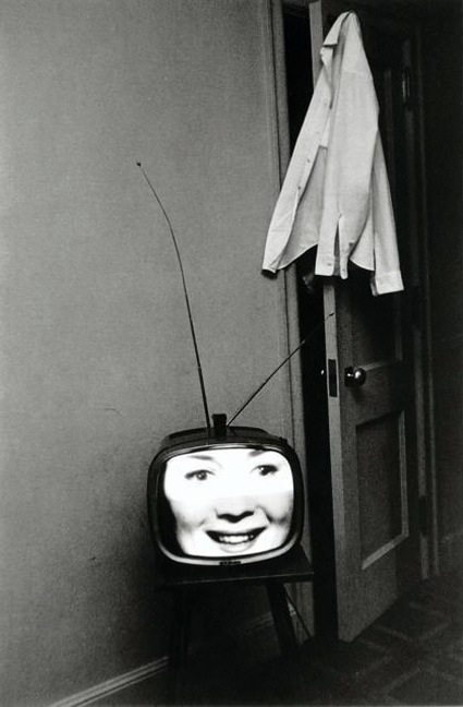 Lee Friedlander has captured the interior of American home as they were starting to be taken over by television. The black and white photographs, all taken in the early 1960s, convey an eerie feeling. The tv screen seems to intrude on the household, to act as voyeur rather than as an object whose sole purpose is to be viewed. What makes each photograph even more uncomfortable is that the tv viewer is absent. On the other hand, the images glowing on the screen are given a kind of humanity and have thus come to substitute to the spectator.